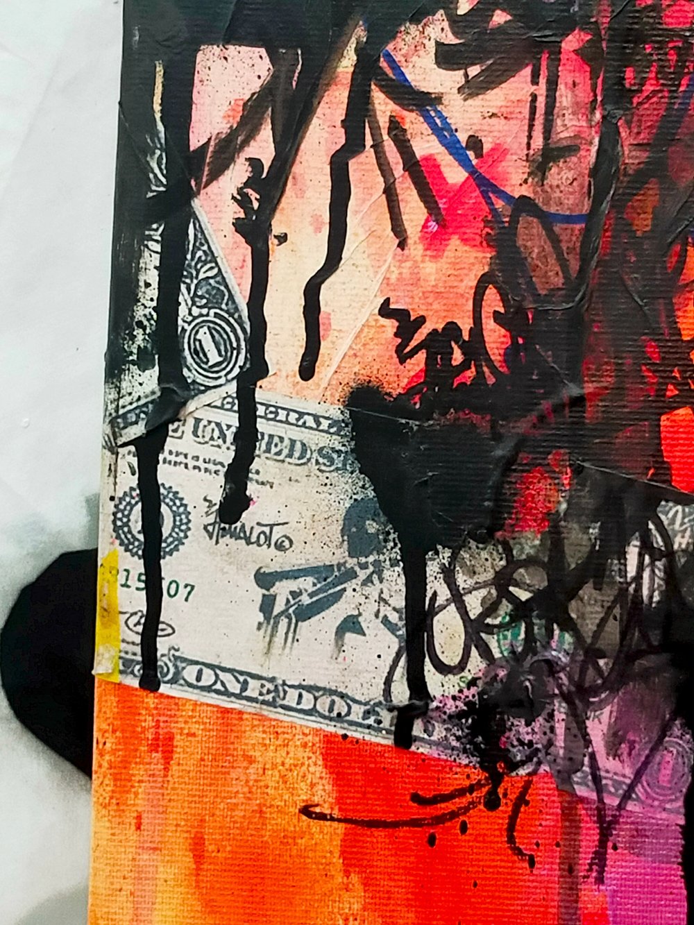 Mixed media technique including stencils on canvas with stencil spray paints, brush-applied acrylics, and various inks. Collages of screen-printed tissue papers from Shoot The Bank and USD STBank bill printing. Double-layer varnish.