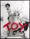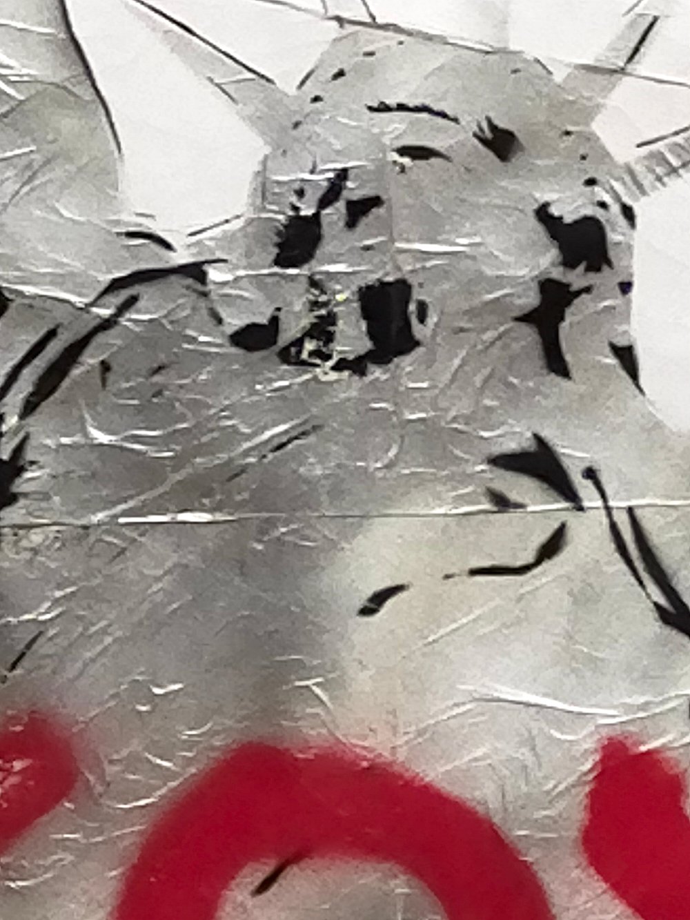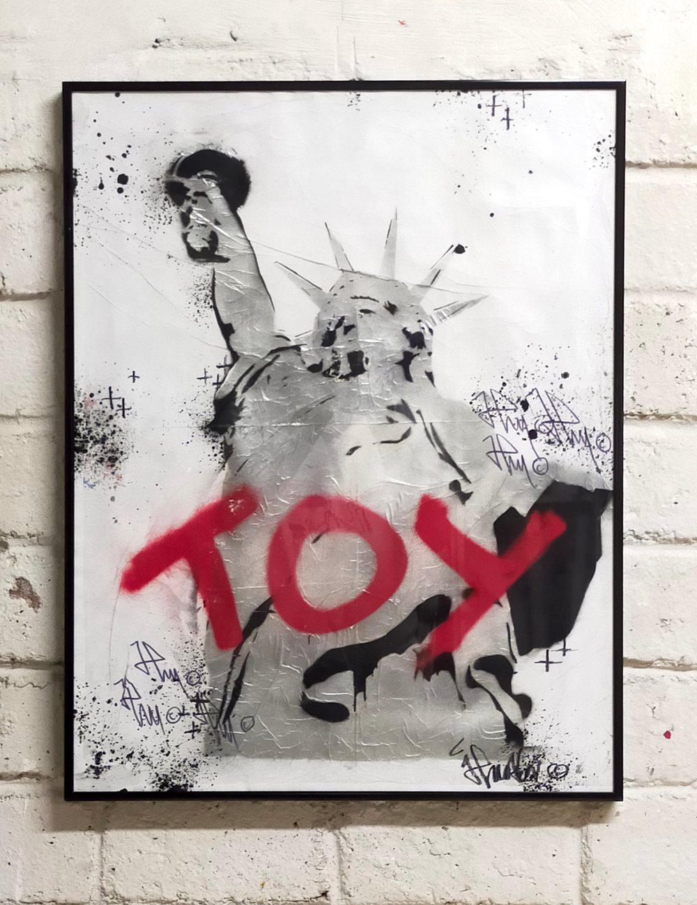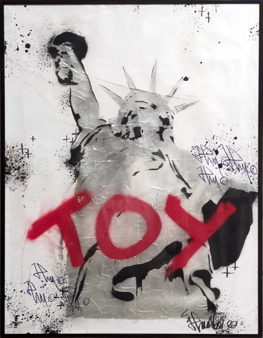 Statue de la liberté faite au pochoir avec inscription 'TOY' à main levé à la bombe.