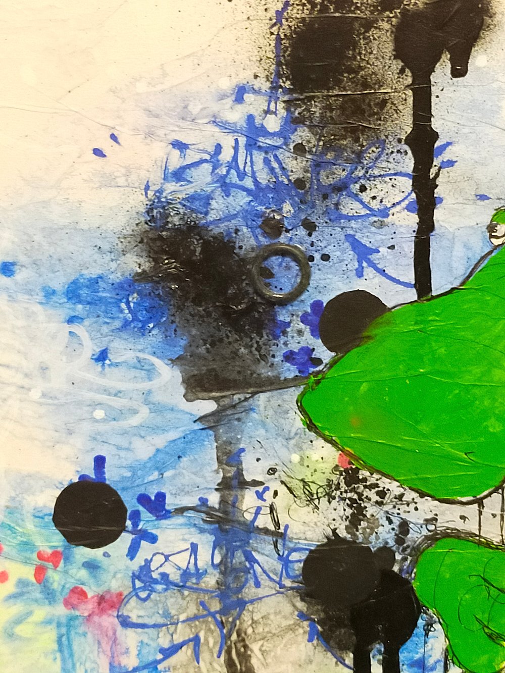 Oeuvre de technique mixte incluant papier de soie collé sur fond de bois, peintures aérosols, encres, acryliques.