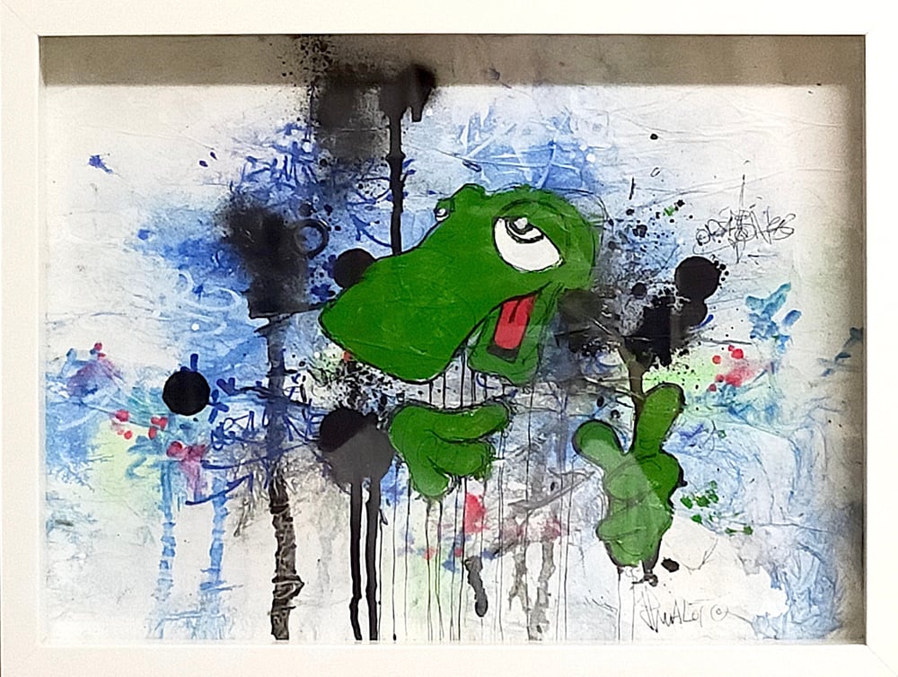 Iconic graffiti character, Wizard (by V. Bodé), painted on a background tagged by the artist.